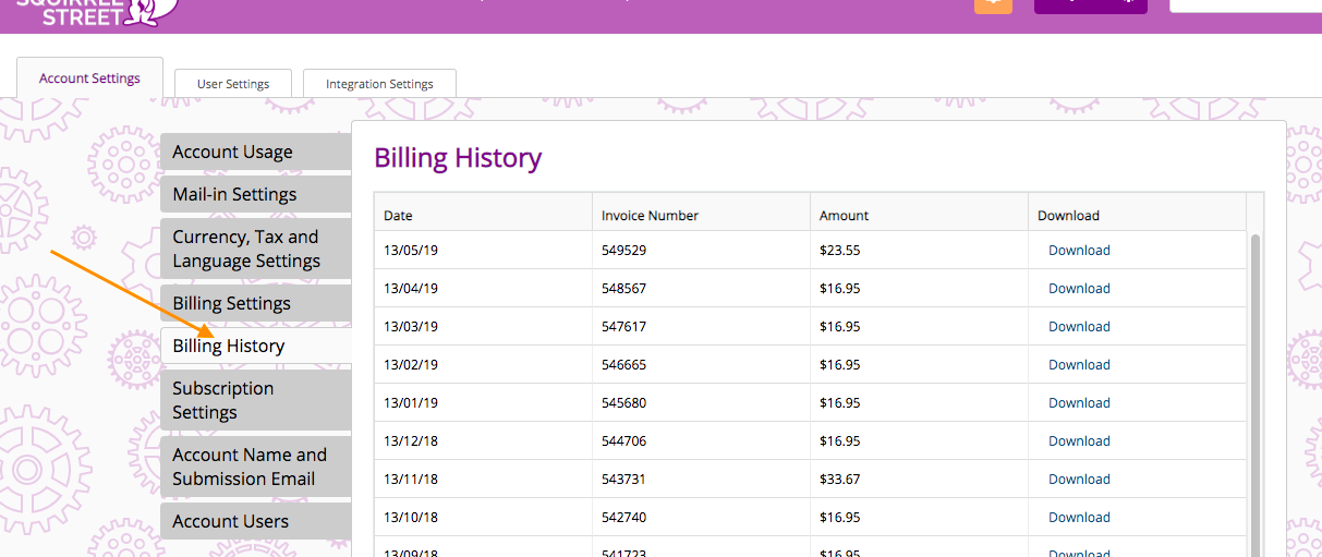 c) In the Account Settings menu, Click on Billing History, where you'll find all your receipts from Squirrel Street. Click on Download for any of them, then submit the file(s) to your account as normal.