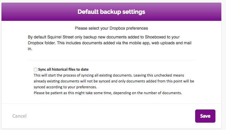 The final step of the authorisation process is to select if you want all documents already in your Squirrel Street account to be backed up to your Dropbox folder: